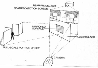 large plate glass pane, set at a 45 degree angle that reflected brightly lit