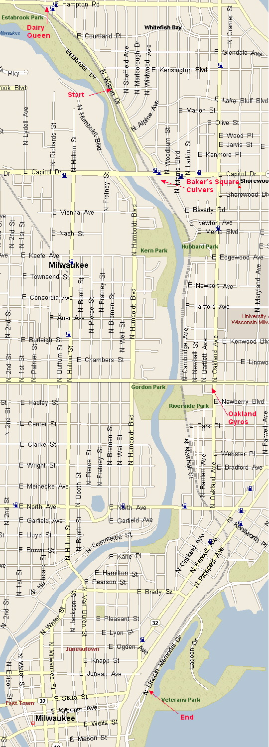 box. Leave the clues to your new box in the previous box. I will be the one to keep an eye on the series as it grows, but you can include your box in your "P" count. Let me know by email (see my homepage) when you plant a new box, and I will keep track of where the boxes are, their stamp images, and clues, so if any go missing, the series can be quickly fixed. You can add as many boxes to the series as you desire. You can continue to come back again and again to find the new boxes as the series grows, and you can come back again and again to hide more boxes! So what stamp images would work for this series? Anything and everything! There can be a reason or no reason at all for the stamp image! You could do an image of things you'd expect to find on a bike pathway through woods in the city: bikers, runners, in-line skaters, walkers, trees, parks, deer, little furry animals, graffiti, puddles, abandoned RR tracks, bridges, various businesses, city streets, lamp posts, ... the list is endless! You can make a stamp and box before you arrive, or plan to make one on the spot that is representative of the spot you plan to hide your box (or buy a commercial stamp). Don't want to hide a box? Fine! Enjoy the ones that are there! The trail begins across the street from the intersection of North Wilson Dr and East Congress Street in Shorewood, WI in Milwaukee County. You can park on Congress or Wilson. The trail is an old railroad right-of-way that has been converted into a bike path, and runs south all the way to the War Memorial on the lake (or from Oak Leaf Trail/MCP Series-Estabrook Park #2 to Caltrava/Green One in letterbox orientation!). There is literally miles of trail to hide boxes on, so this series has lots of growth potential! (Although you may walk the entire distance, the time has come where biking may be the way to do this series!) Clues: Start at the spur of the asphalt path across the street from the corner of Wilson and Congress. Walk south on the path (or on the grassy side) until you come to the first asphalt spur. The spur heads west to a parking lot in Estabrook Park and cuts in front of the Channel 6 TV tower. At the spur, turn around so you are facing north. Walk 75 paces north and stop. To your left in the woods (about 10 paces in) spot the 8-9 trunked tree! The first box is nestled in the middle of where all those trunks meet. Enjoy!
