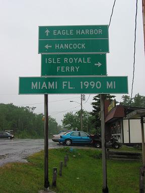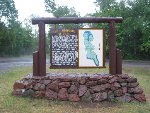 | Clues: Start in Miami, Florida. (While you're there, you might just as well go down to the equator and start looking for Matt the Rat's 45th parallel box ;-) ) Take US Hwy 41 from its start through all 8 states it passes through on its way north. After 1990 miles, you'll end up in Copper Harbor, MI. Continue on US 41 northeast past Copper Harbor to the point where US 41 actually ends (past Fort Wilkens SHP). Park in the back of the turn-about behind the sign informing you about US 41. Read the interesting information on the sign, then go behind the sign. From the back of the sign take a bearing of 41 degrees, and walk 41 paces (1 pace = 1 step) on that bearing (Yes! This actually turned out perfect!). You'll just enter the woods on a small trail. At the end of the 41 paces, there will be a "U" shaped tree on your left, with the right half of the "U" broken off a bit. In the wedge of the "U" is a dead log. Look under this dead log and the roots of the "U" tree to find the box! |
