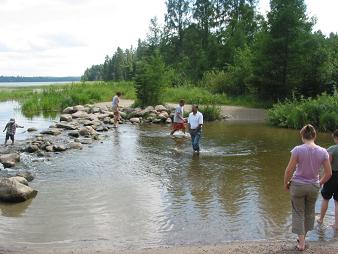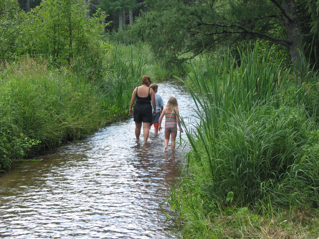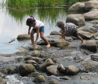 | Go to the headwaters of the mighty Mississippi. Spend some time walking across (below left), through (above), and down (below right) the Mississippi. If you walk on the rocks right at the headwaters (see kids below), be very careful - they are very slippery! | ||||||||
